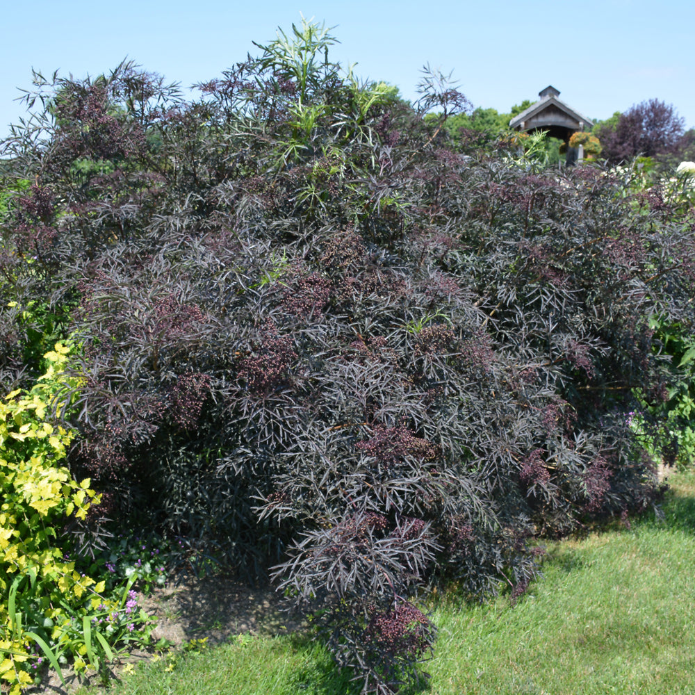 Black Lace® Elder will grow to be about 10 feet tall at maturity, with a spread of 8 feet. It has a low canopy with a typical clearance of 1 foot from the ground, and is suitable for planting under power lines. It grows at a fast rate, and under ideal conditions can be expected to live for approximately 30 years.