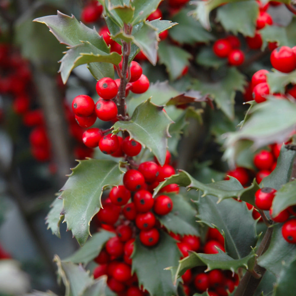 Description: One of the hardiest of the evergreen hollies, this is a large, spreading shrub with the traditional spiny blue-green foliage and showy red berries in winter; requires a male pollinator, often paired with Blue Prince