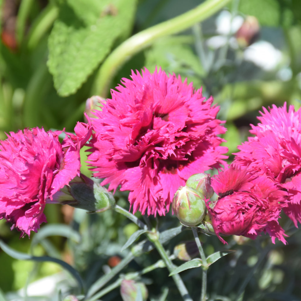 Description: Heavily serrated double flowers are vibrant fuchsia pink with deep red eyes, above mounds of steel blue foliage; great for flower arrangements; deadhead to rebloom; pair up with summer blooming perennials and annuals to time a continued flower display
