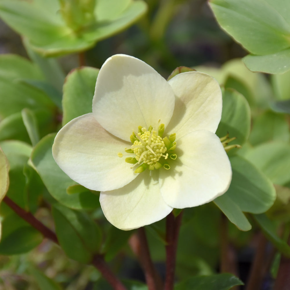 HGC® Champion Hellebore features showy nodding creamy white cup-shaped flowers with buttery yellow eyes and a pink reverse at the ends of the stems from mid winter to early spring, which emerge from distinctive rose flower buds. Its attractive serrated oval compound leaves emerge chartreuse in spring, turning dark green in color the rest of the year. The brick red stems can be quite attractive.